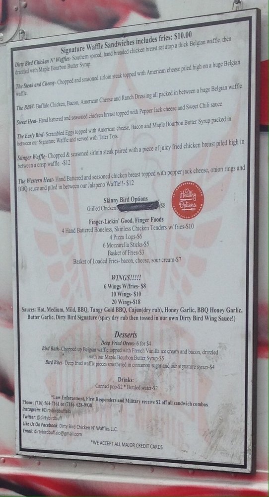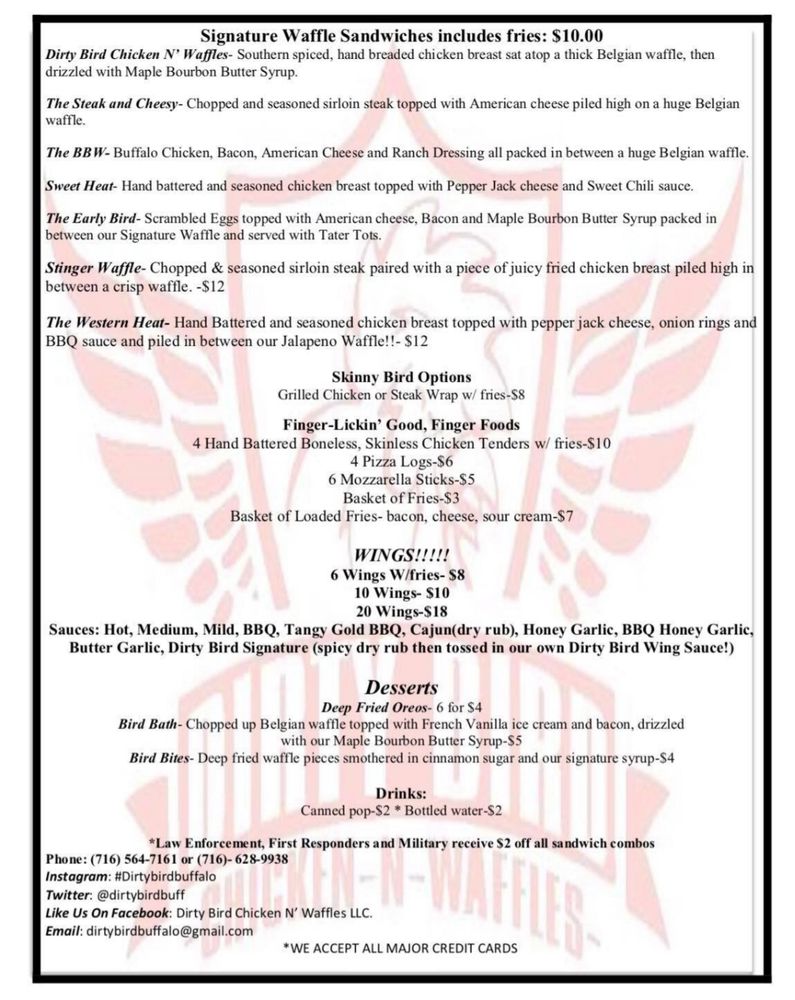 Introducing the menu of Dirty Bird Chicken N' Waffles, located in Niagara Falls, NY. This Black-owned establishment offers a unique combination of chicken and waffles, fish fry options, and dessert waffles. The Fish Fry Everyday menu features various fish dinner options like Haddock and Catfish, while the Dessert Waffles offer indulgent choices like Cinnamon Toast Crunch and Oreo. Customers have raved about the flavorful and well-seasoned chicken and waffle sandwich, paired with bourbon syrup. The food truck offers a casual dining experience with outdoor seating and Wi-Fi, making it a great spot for families and individuals alike. With the perfect balance of sweet and savory, Dirty Bird Chicken N' Waffles promises a satisfying and delicious meal that will leave you wanting more.